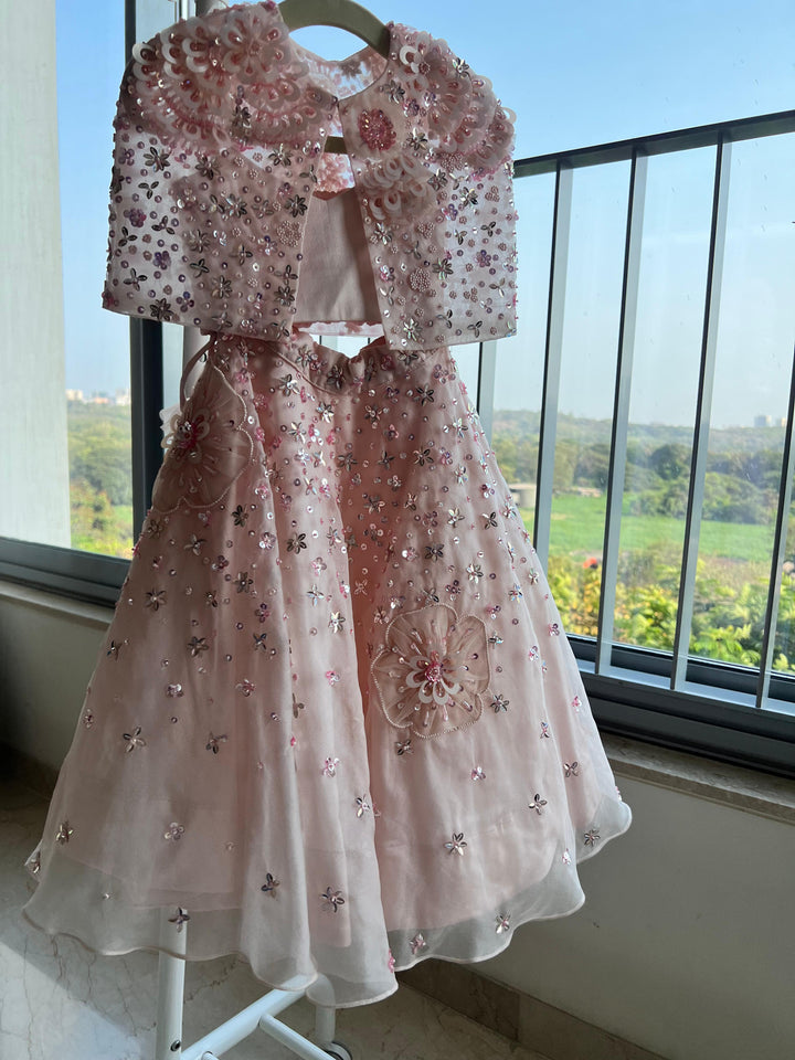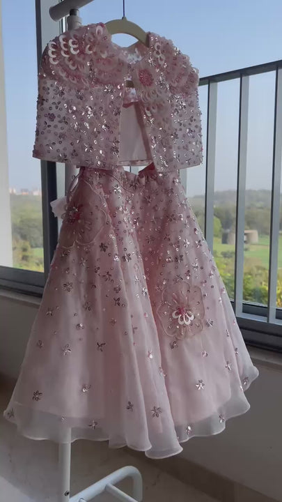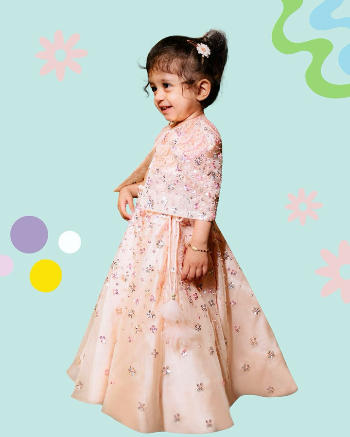 Elevate your little one’s style statement with this pastel hued lehenga and cape set. Perfect for special occasions, this outfit is expertly crafted and hand embroidered. It comes as a set of three